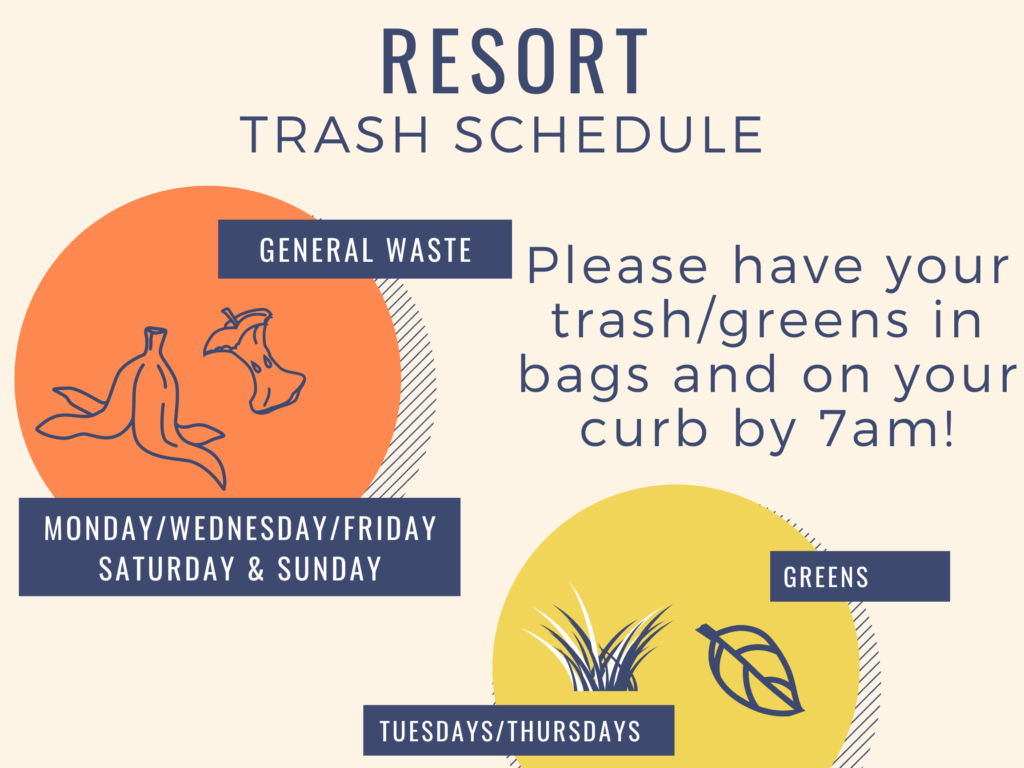There are waste and recycling bins located near the Main Laundry. Please be mindful of this area. If these bins are full, do not leave trash there; please take it back to your lot until the next scheduled pickup.
