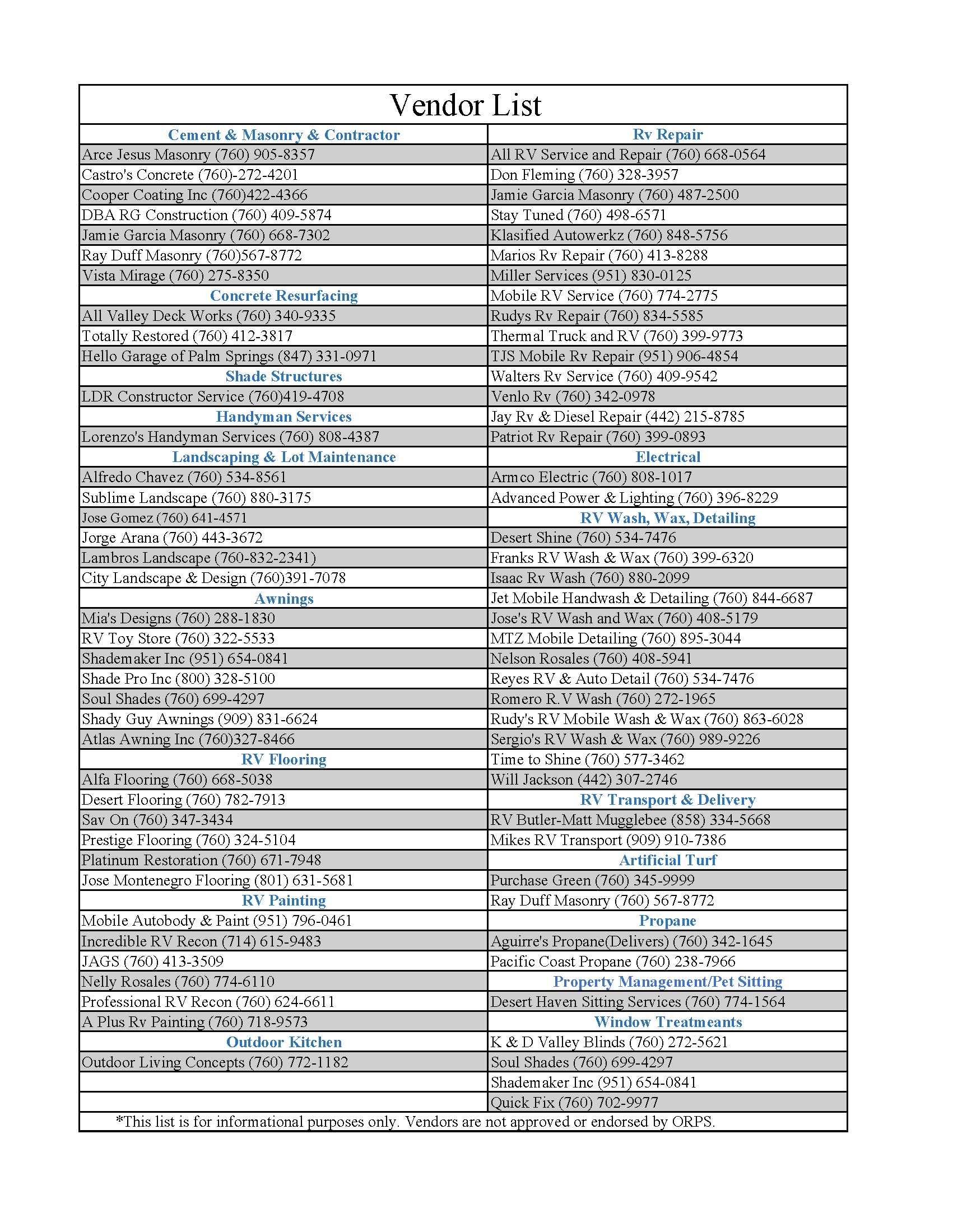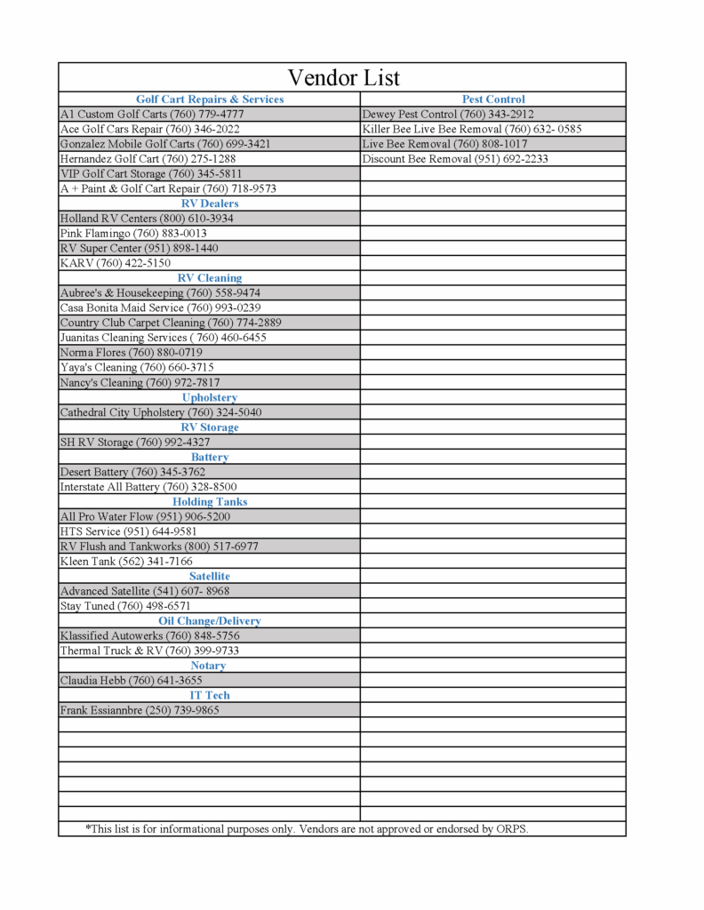 This is a list of area vendors and is strictly distributed as a courtesy to our owners and guests.