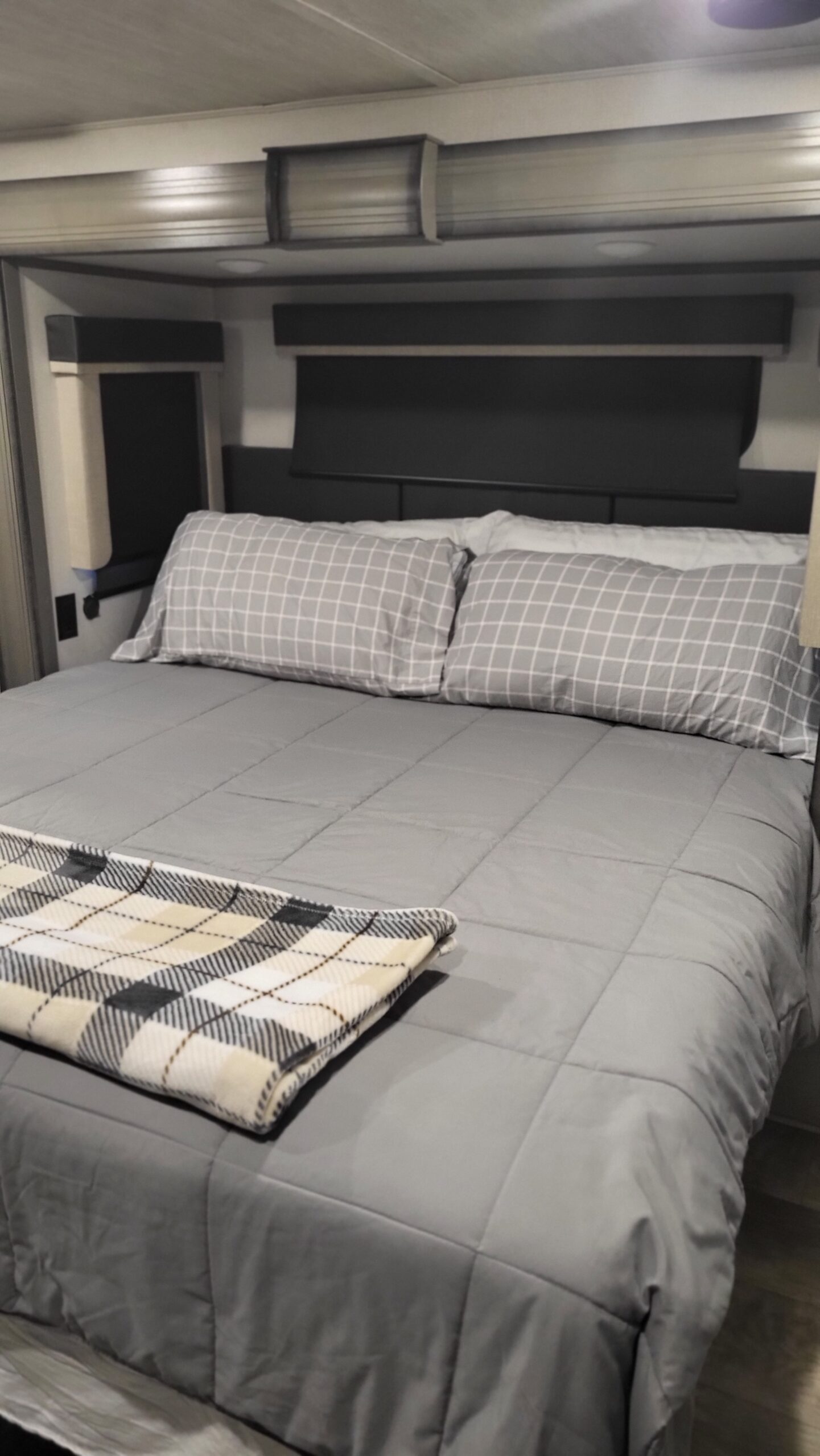 This RV sleeps two in a king-sized bed, and the living room couch is also a hide-a-bed. The RV is roomy and has a fully equipped kitchen. There is a barbecue for your outside dining, along with a comfortable patio with a fireplace and chairs. Inside, you will find dishes, pans, a coffee pot, and all cooking necessities.You are just a few steps away from a swimming pool, hot tub, showers, tennis court, laundry facilities, and a restaurant. The mountain views from the RV and your patio are spectacular. The evening lights are soothing.