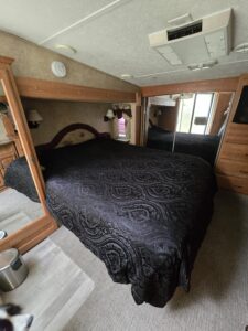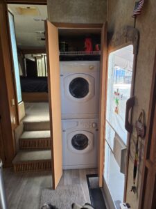 Sleep number bed, Dining table with 4 chairs, 2 recliners, a couch that folds out into a queen air bed and stacker washer / dryer.