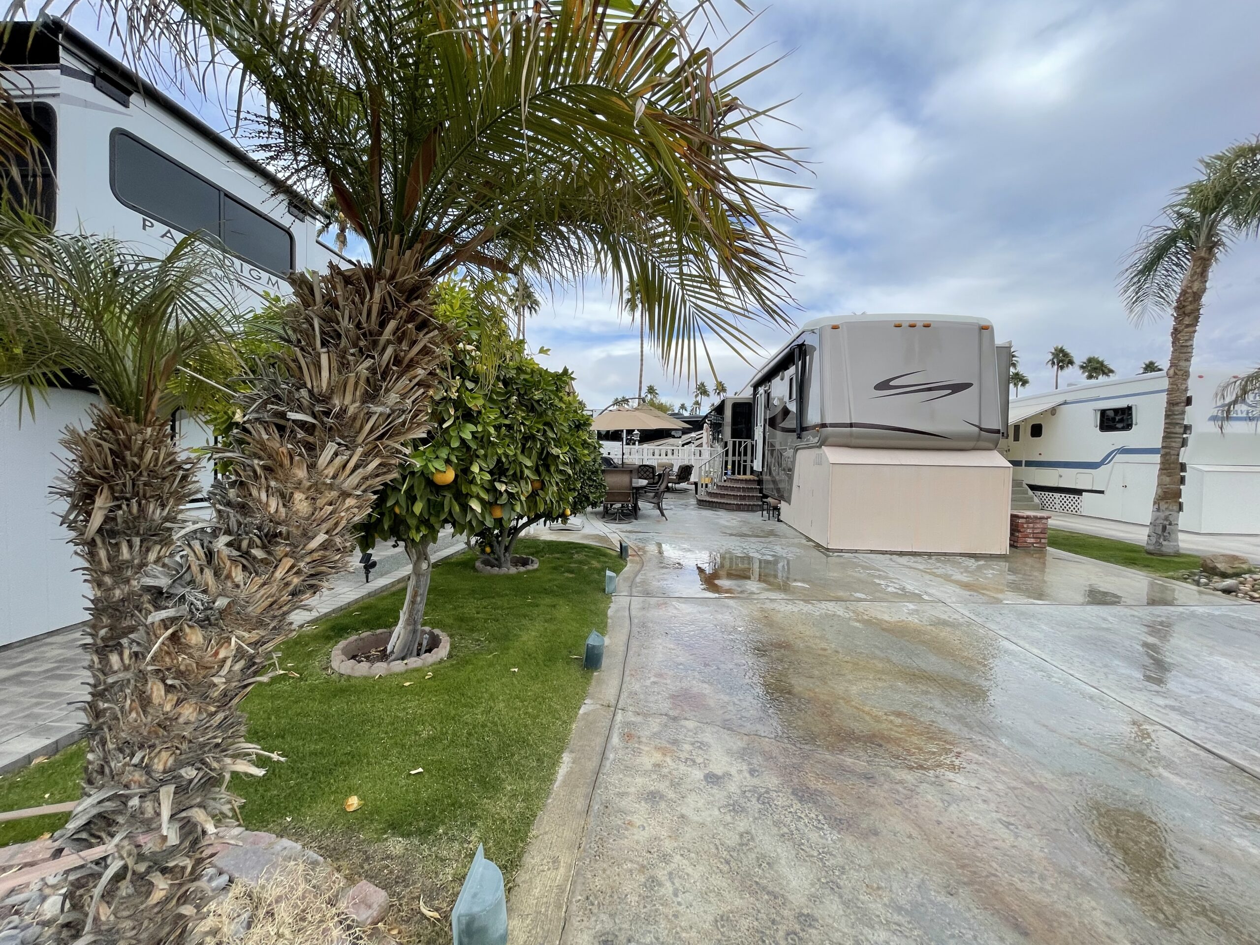 This well-maintained RV features a mahogany wood interior, hardwood floors, a fireplace, electric window shades, and includes a side-by-side refrigerator, dishwasher, washer and dryer, and a household toilet. Additional items include patio furniture, a golf cart, and grapefruit and lemon trees. Located in a gated resort with amenities such as a 27-hole golf course, tennis courts, a fitness center, two clubhouses, a beauty salon, a restaurant, a dog park, and eight swimming pools. The lot is across from the Satellite C swimming pool and tennis court. All for $164,000.