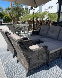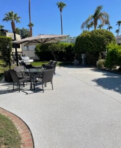Lot 443 displays epoxy floors, LED lights, outdoor furniture, and umbrella shade this