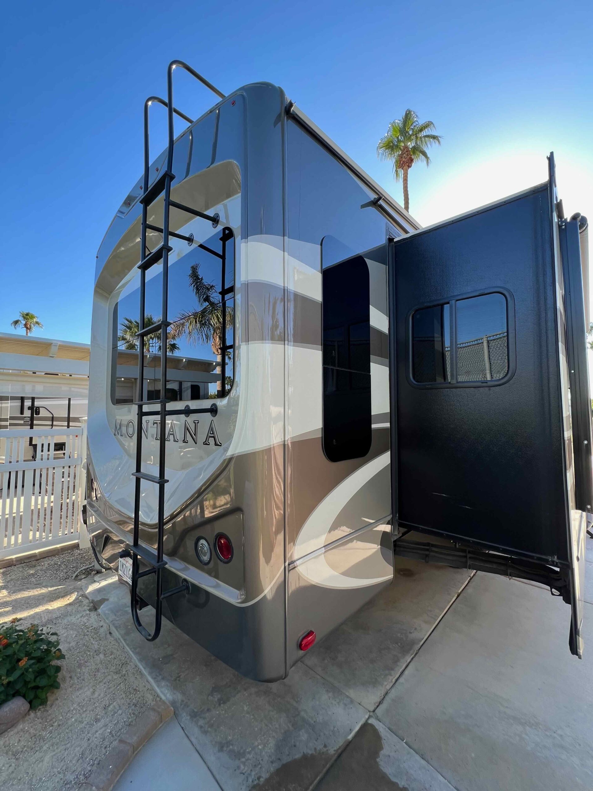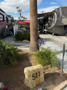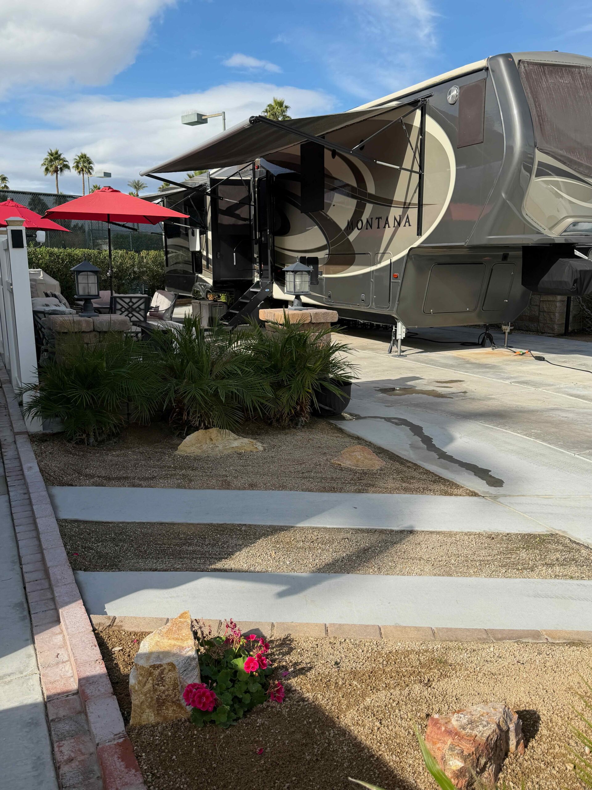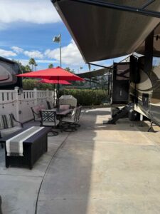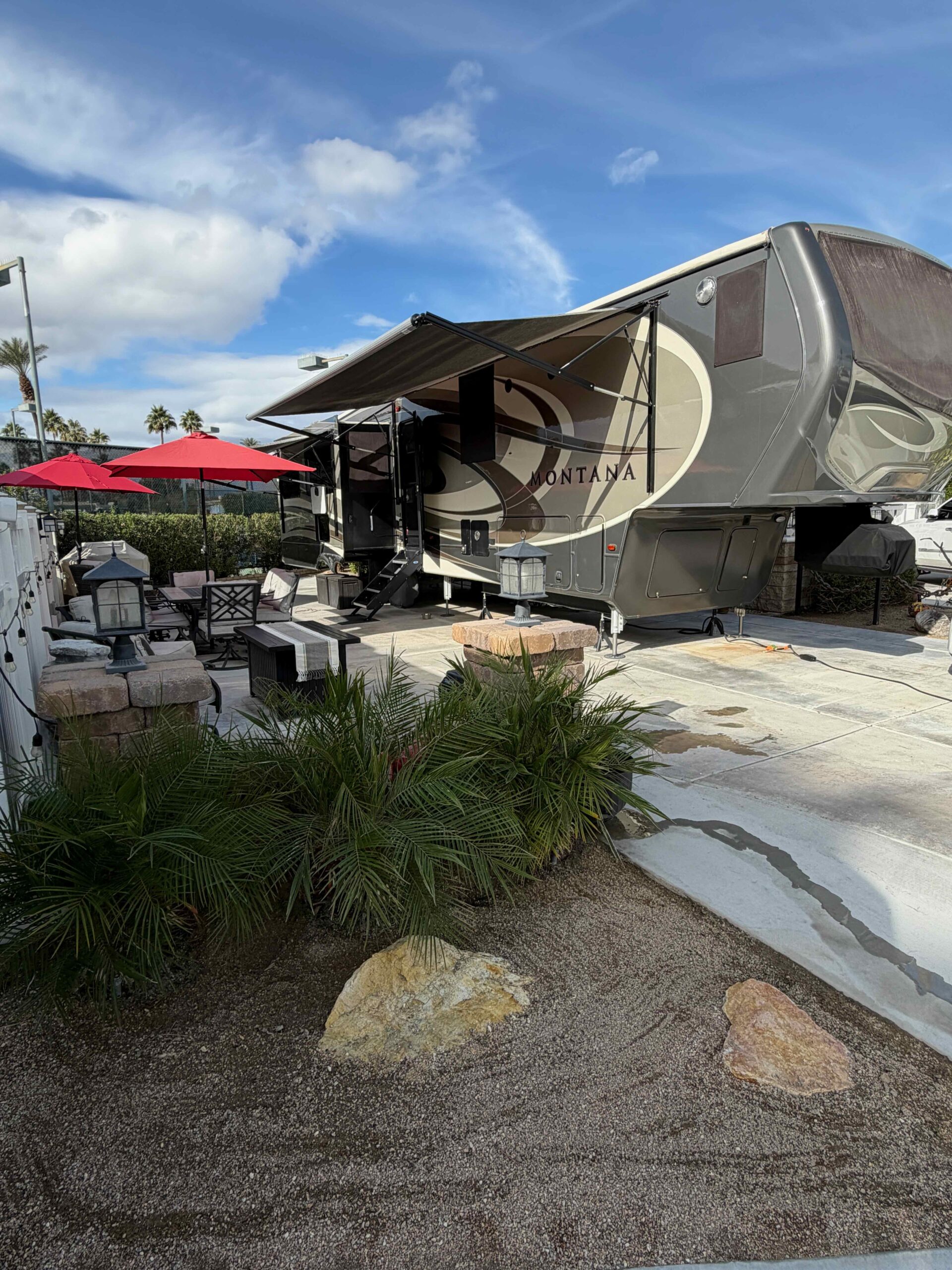 Lot 511 features a 2018 Montana 3921FB Bath and a Half Luxury Living model, equipped with residential appliances and the Legacy Package, which includes full body paint. The lot has been recently expanded to maximize patio space for easy maintenance, and new fencing has been installed on both sides. Enjoy morning sun and afternoon shade.