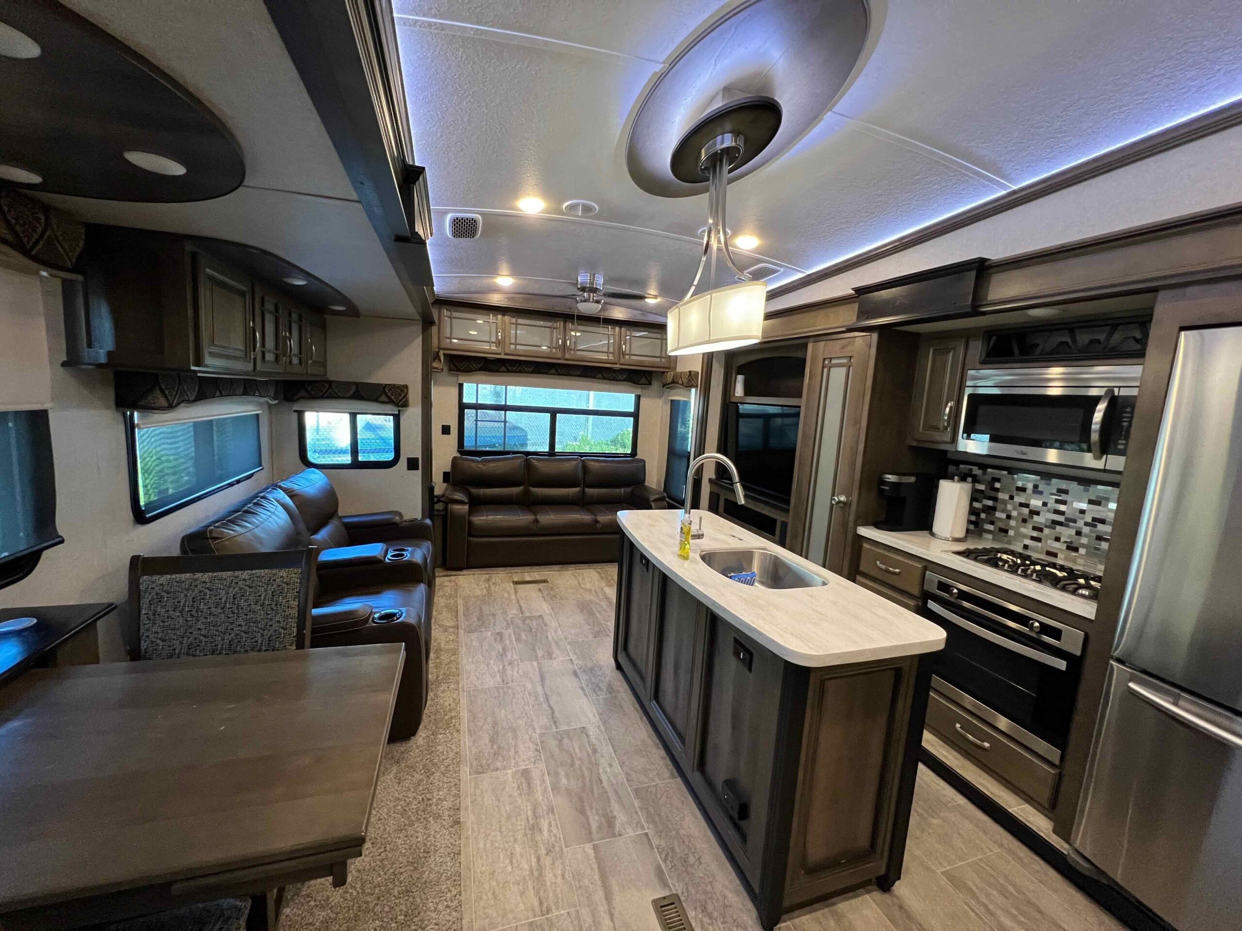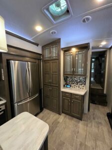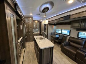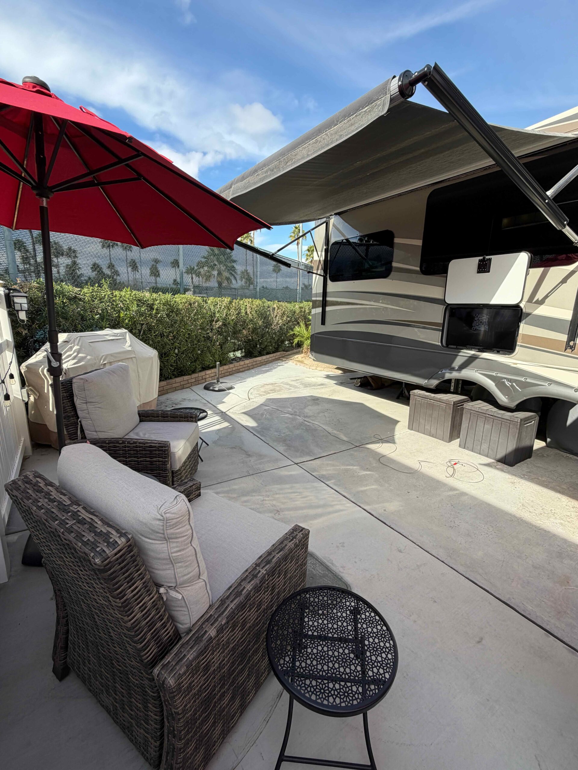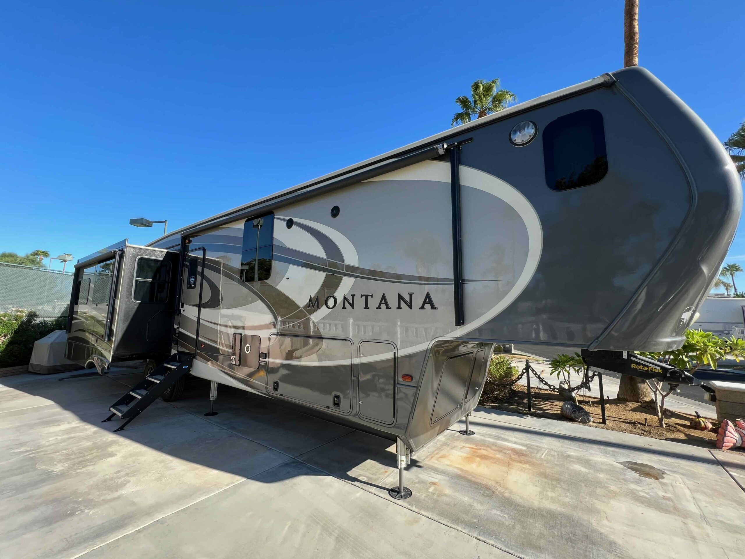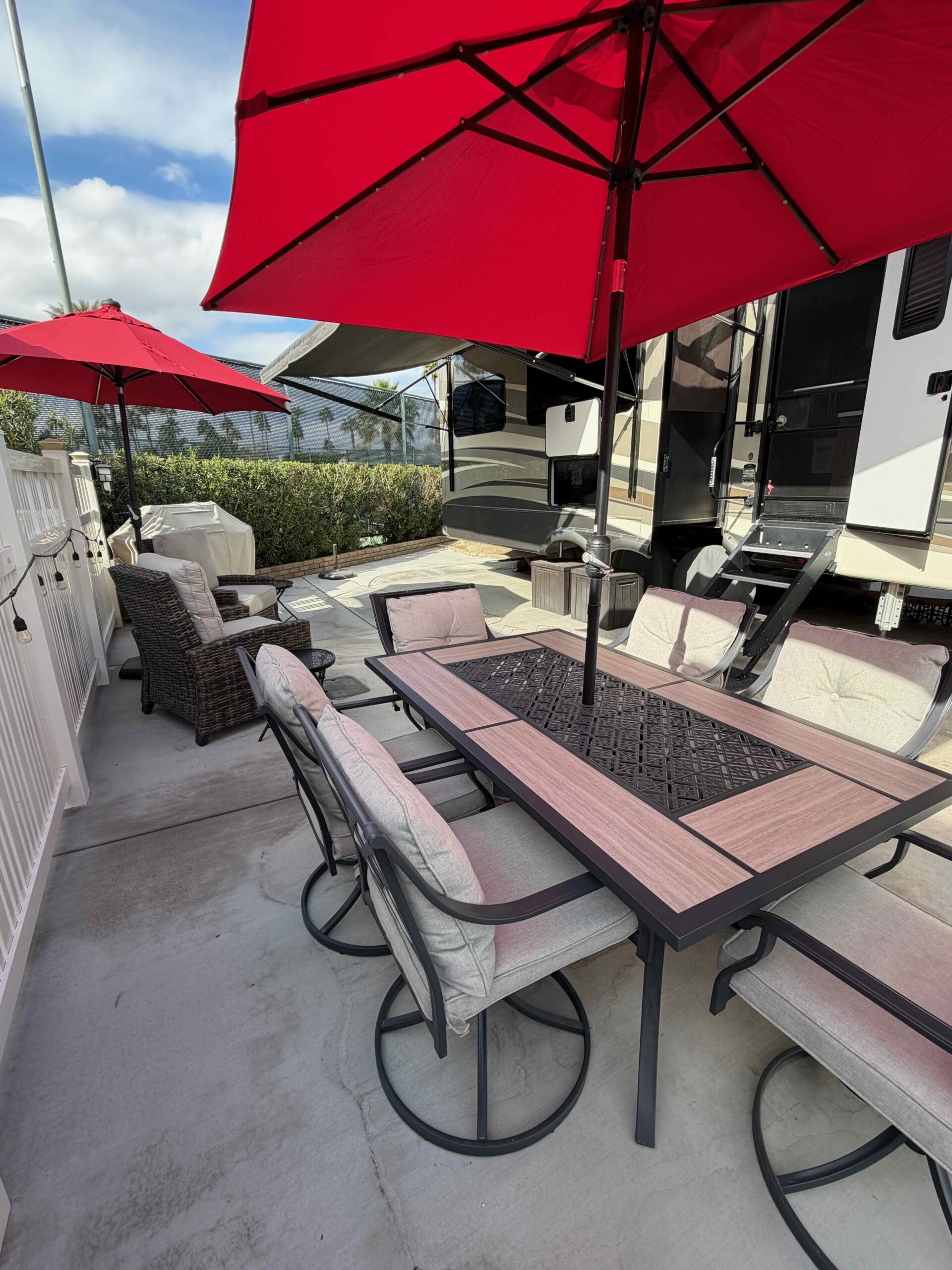 Lot 511 features a 2018 Montana 3921FB Bath and a Half Luxury Living model, equipped with residential appliances and the Legacy Package, which includes full body paint. The lot has been recently expanded to maximize patio space for easy maintenance, and new fencing has been installed on both sides. Enjoy morning sun and afternoon shade.