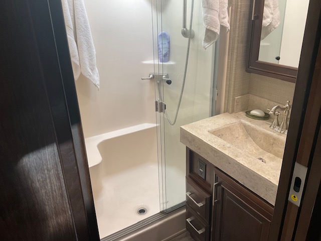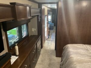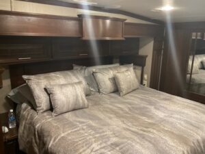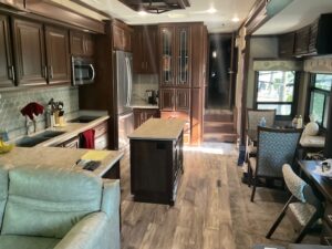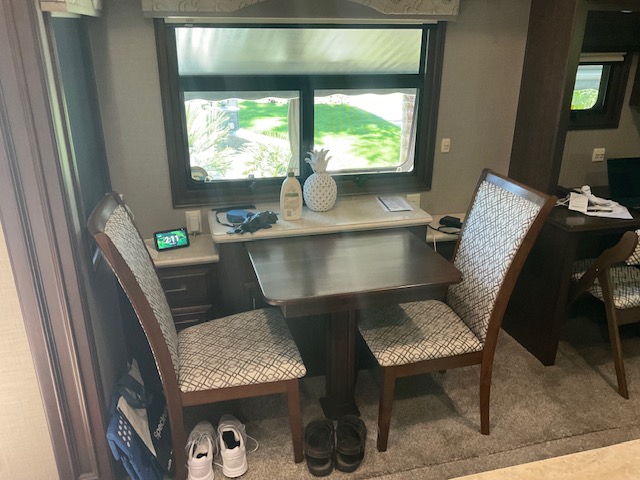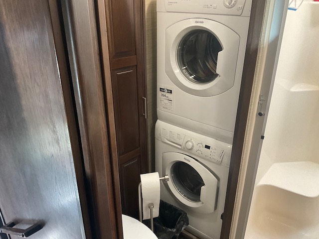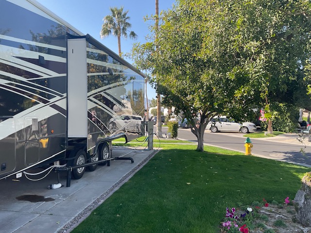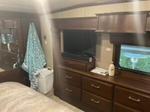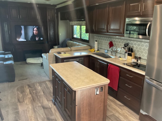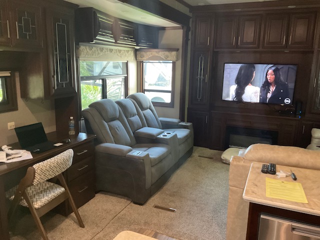 The 44' Mobile Suites features a doghouse, a new king bed, a queen pullout in the living room, 2 TVs, a dishwasher, a washer and dryer, a full-size fridge, electric recliners, patio furniture, and a barbecue. It is located on an end lot. Electric and resort fees apply, with consideration for long-term rentals.