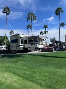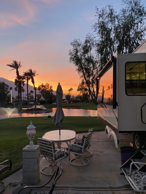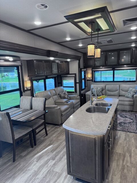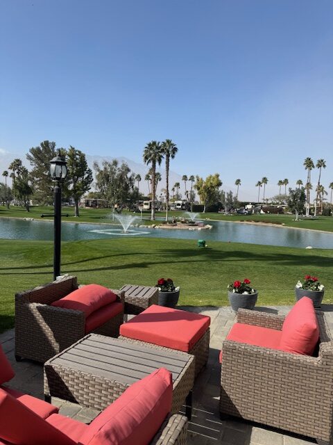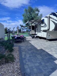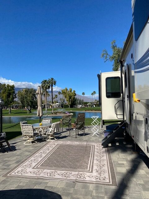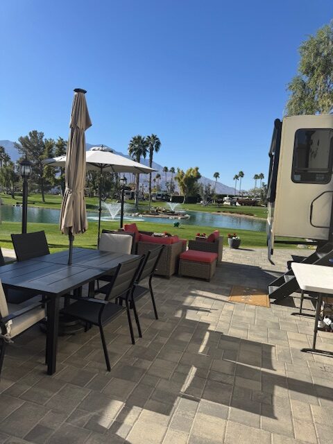 This prime golf course lot on the lake offers one of the best views in the resort. The fully expanded lot features new pavers that were installed two years ago. The price includes all furniture, tables, and umbrellas. Additionally, a 41-foot Solitude RV is available for sale as well.