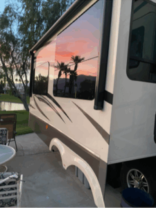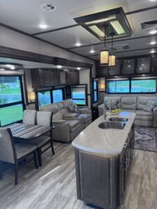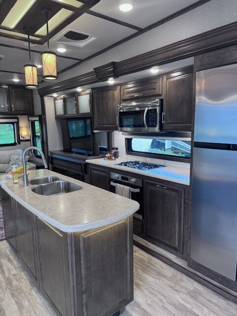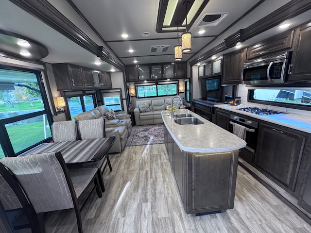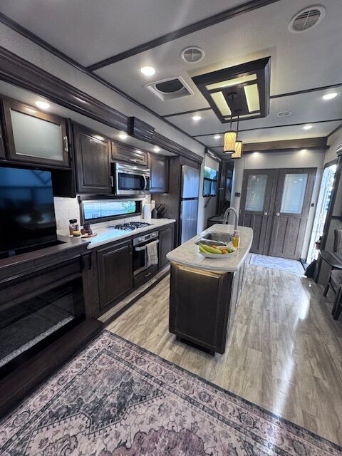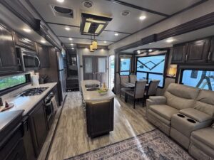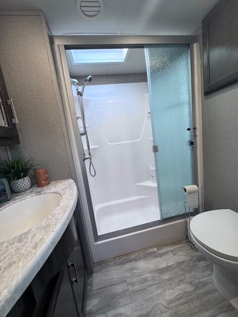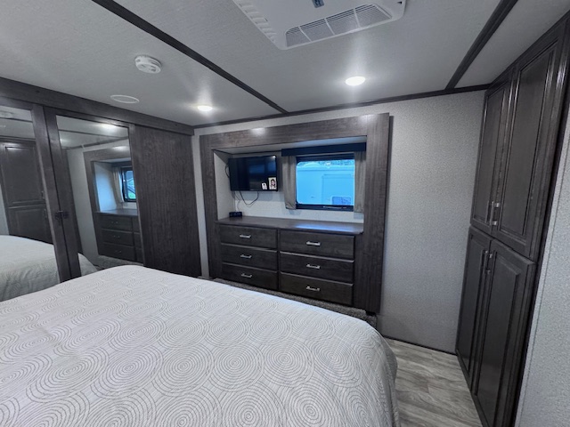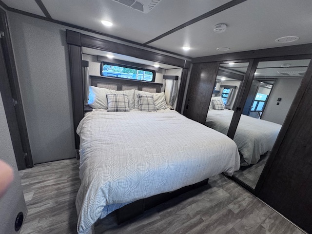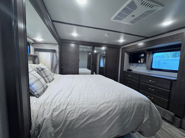 The RV comes with the Four Seasons Package and has solar panels on the roof. It features a brand new one-piece roof membrane and new plywood, as it previously had a small tear in the roof that was covered by insurance. The RV is stored inside a climate-controlled shop when not at ORPS.