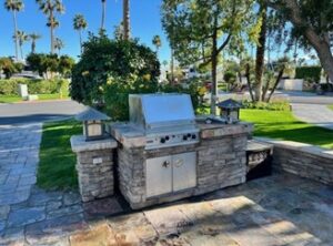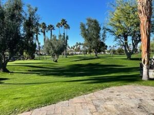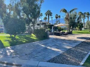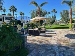 Bring your own RV to rent this premier corner golf course Lot in Outdoor Resort Palm Springs. The Lot includes a patio sofa, two chairs, a bar table and chairs, a Viking BBQ, and a large cantilever umbrella.