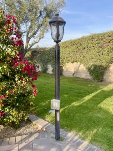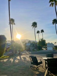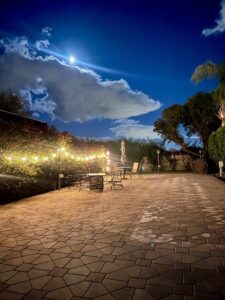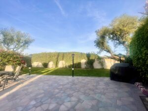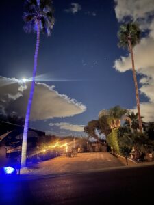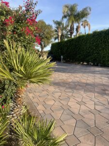 At the front, you’ll find a custom stone lot sign with new accent lighting, adding curb appeal and a personalized touch. A lush bougainvillea hedge provides natural beauty and privacy, while decorative palm trees and crushed granite ground cover enhance the desert, low-maintenance landscape.