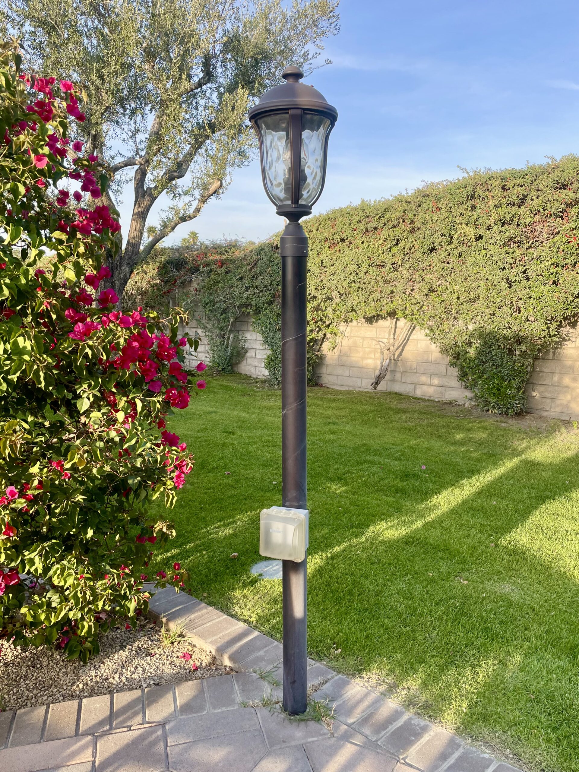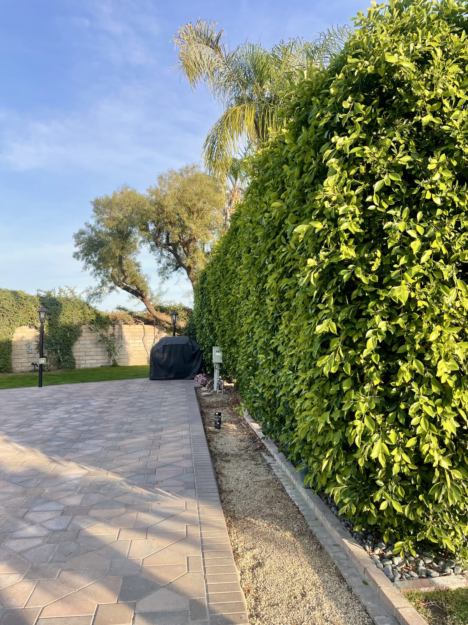 - Bougainvillea hedge & decorative palm trees